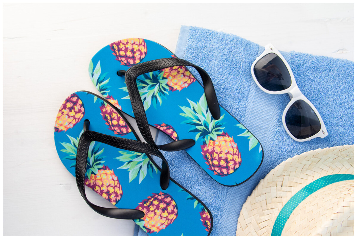 Unisexové, sublimační plážové pantofle s černými PVC pásky. Cena včetně sublimačního tisku. MOQ: 50 ks.