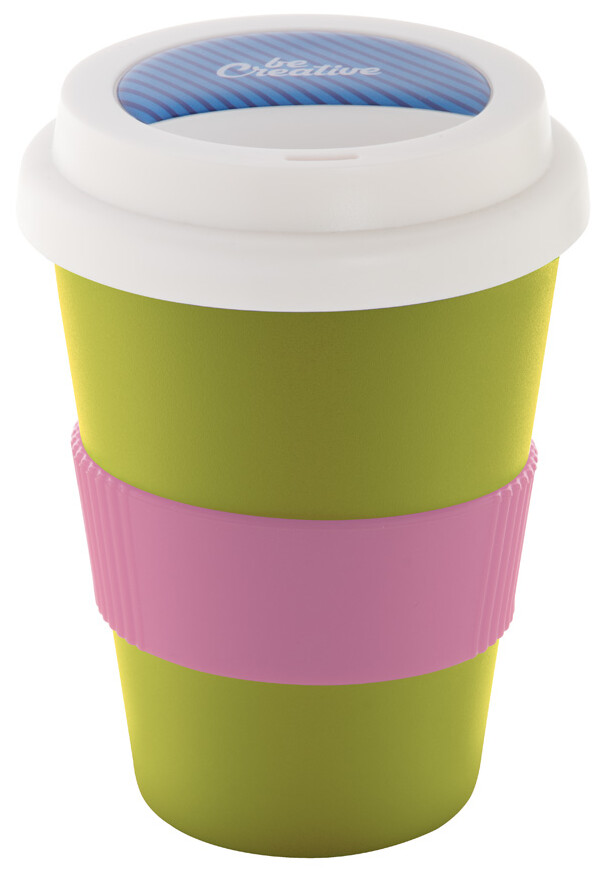 Dvoustěnný plastový termo hrnek s víčkem na pití a silikonovým úchopem na zakázku. 300 ml. Min. mn.: 50 ks.