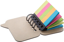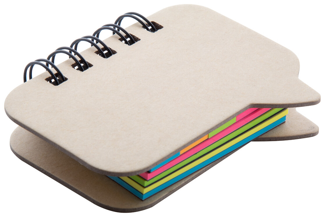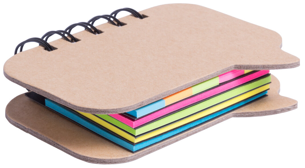 Blok s různě barevnými samolepícími lístky (100 ks 5,1x7,5 cm a 100 ks 1,5x5,1 cm), ve spirálové vazbě s deskami ve tvaru bubliny z recyklovaného papíru.