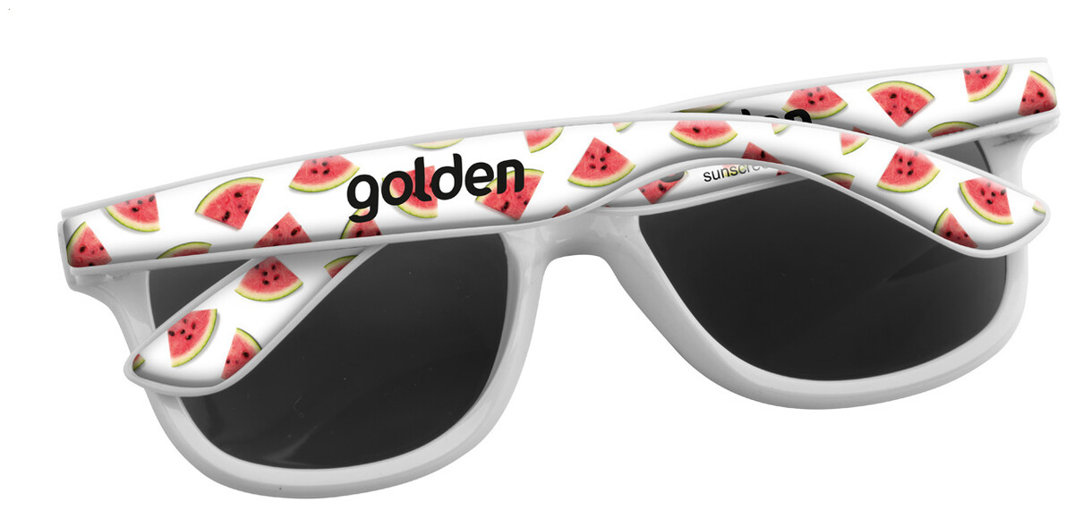 Plastové sluneční brýle se speciálními nožičkami pro epoxy potisk. S ochranou UV 400. Cena zahrnuje epoxy potisk na nožičkách, nezahrnuje tiskovou přípravu. Min. mn.: 100 ks.