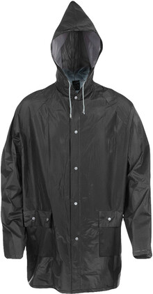 Pláštěnka s kapucí z odolného PVC s žáruvzdornou povrchovou úpravou. Se zapínáním na knoflíky a dvěma předními kapsami.