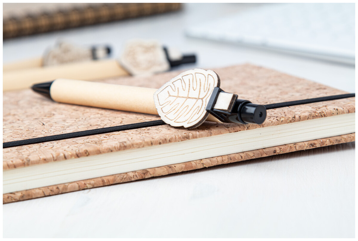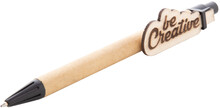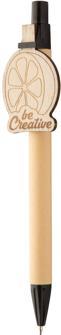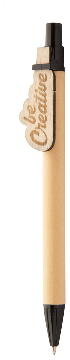 Recyklované papírové kuličkové pero s překližkovým klipem vyrobeným na zakázku a modrou náplní. Klip je vyroben na zakázku - maximální rozměr: 25×35 mm. Cena včetně gravírování loga na klip, nezahrnuje tiskovou přípravu. Min. mn.: 100 ks.