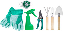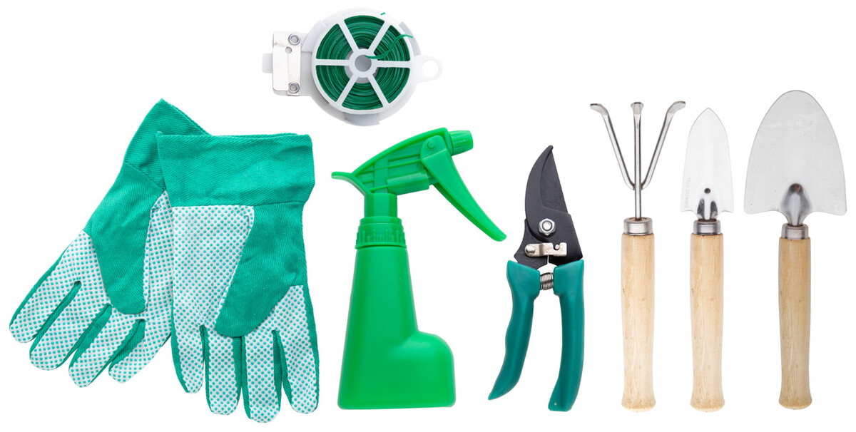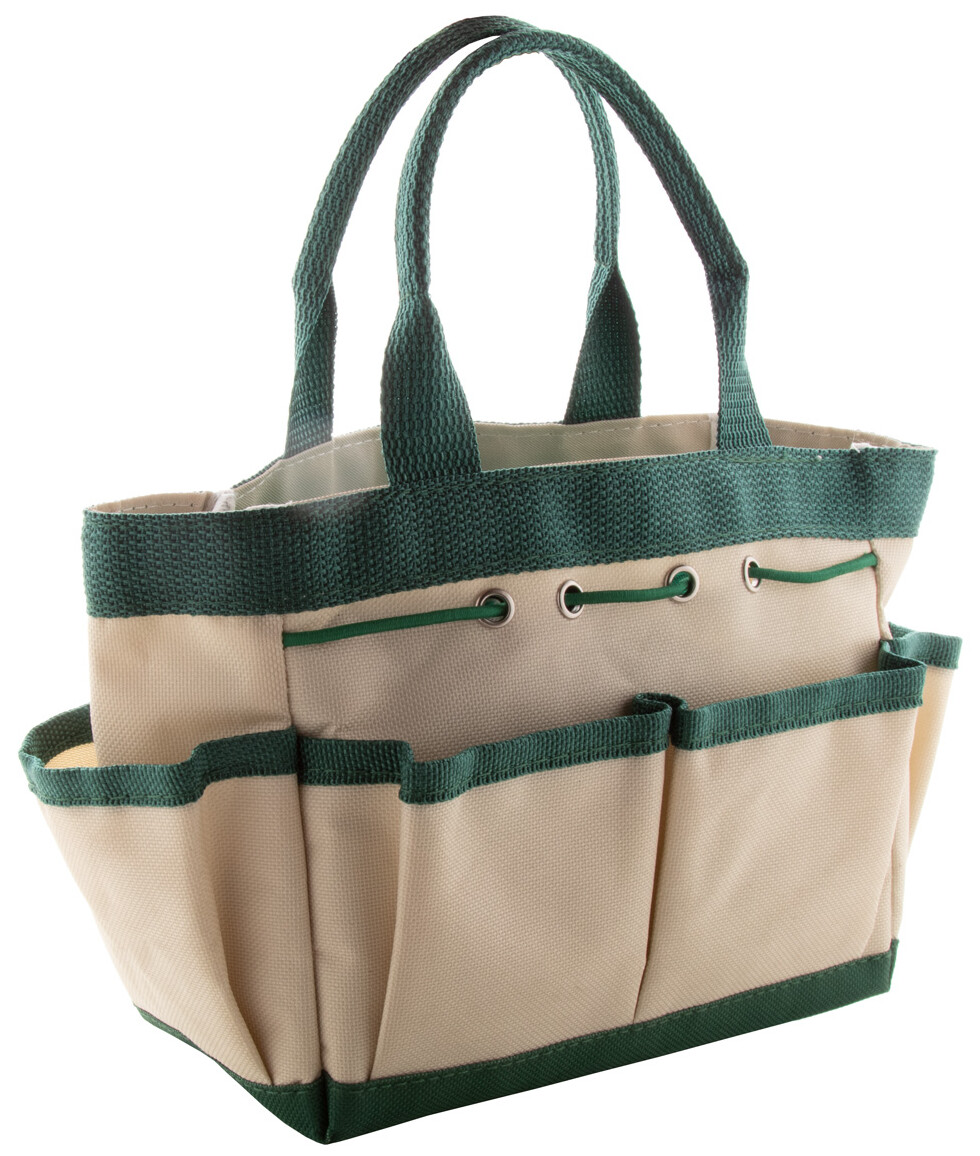 Zahradní nářadí v nylonové tašce s přihrádkami. Obsahuje nůžky na stříhání, ruční vidlici, 2 lopatky, vázací drát s řezákem, rozprašovač a pár rukavic.