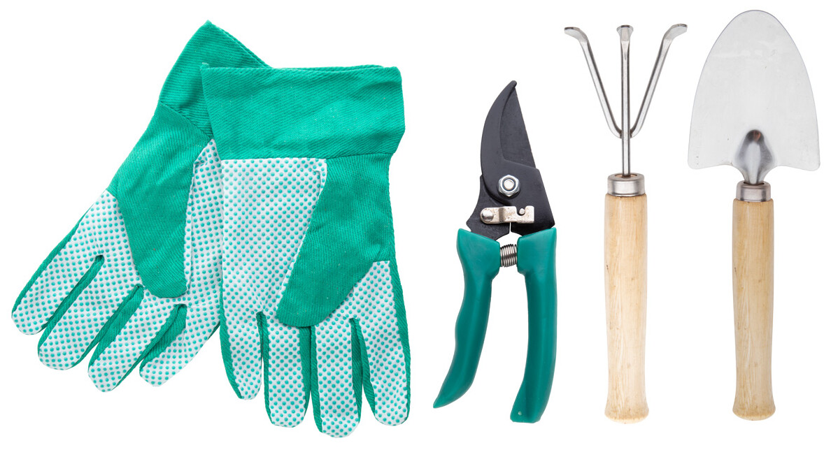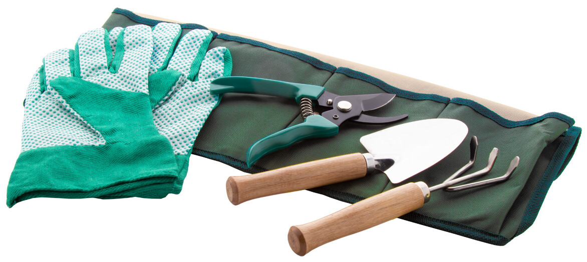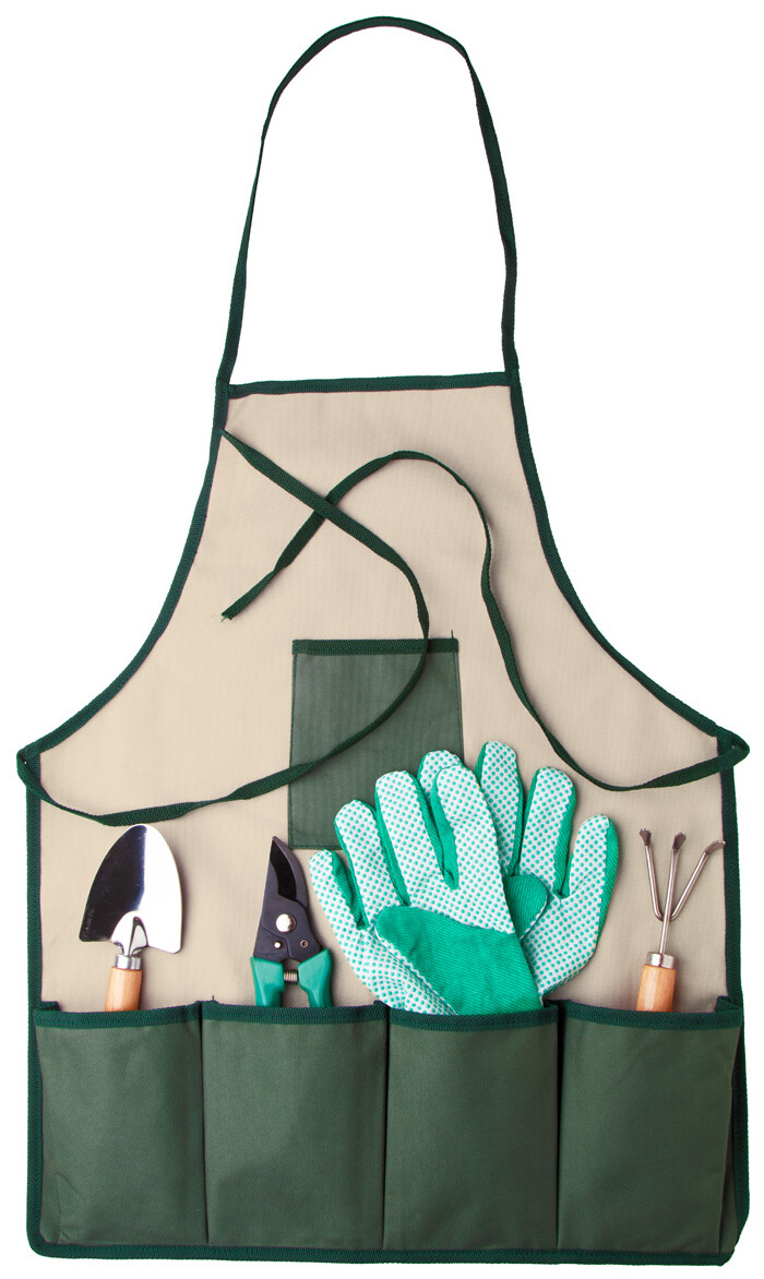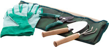 Zahradní nářadí v nylonové zástěře. Obsahuje nůžky na stříhání, ruční vidlici, lopatku a pár rukavic.