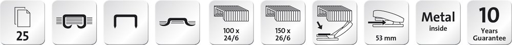 Kapacita je 100 kusů sponek 24/6 nebo 150 kusů sponek 26/6 SUPER a hmotnost sešívačky je 165 g.