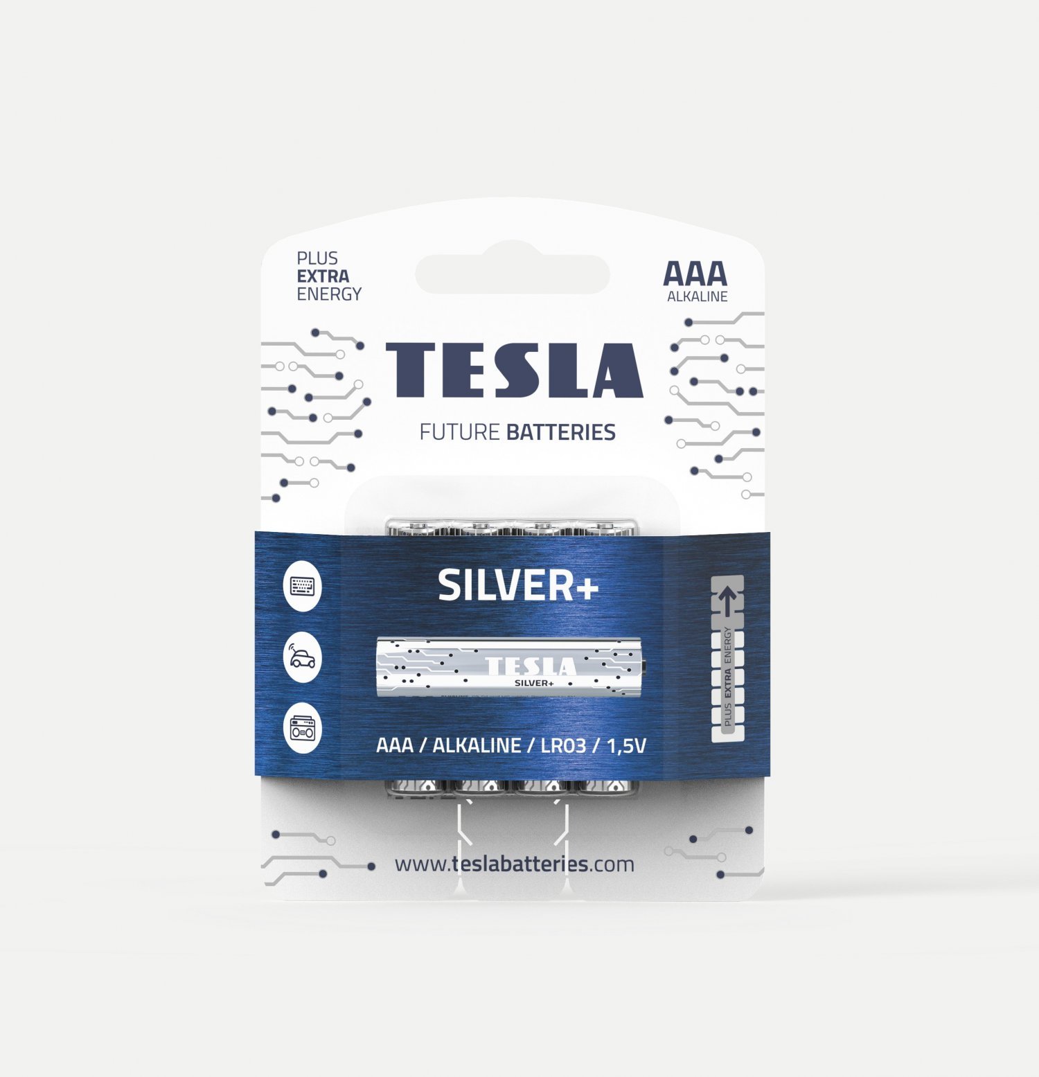 Řada baterií TESLA SILVER+ zahrnuje alkalické baterie typu AAA určené pro přístroje s dlouhodobým vysokým odběrem elektrické energie. Představuje ideální volbu pro elektronické hračky. Tuto řadu specifikuje dlouhotrvající výdrž baterie při stálém energetickém zatížení.