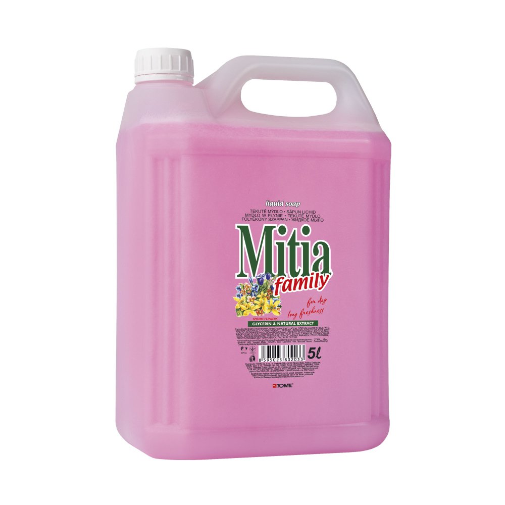 Tekuté mýdlo Mitia Family, Spring flowers, fialové, 5 l je jemné tekuté mýdlo s vůní jarních květin, které efektivně čistí pokožku a zanechává ji svěží a provoněnou.