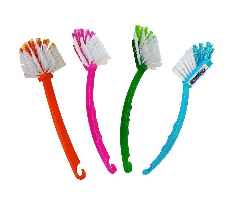Jednoduchý kartáč na čištění a drhnutí nádobí s prohnutou rukojetí, pohodlně padnoucí do ruky, dostupný ve čtyřech různých barevných variantách. Rukojeť je vyrobena z pevného plastu, štětiny kartáče jsou pružné a odolné a vydrží tak bez poškození i dlouhodobé a časté používání.
