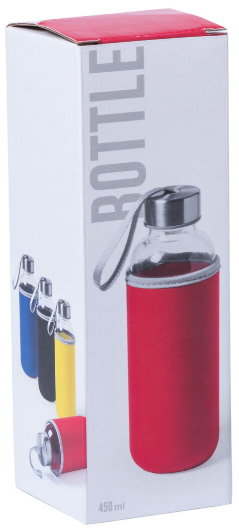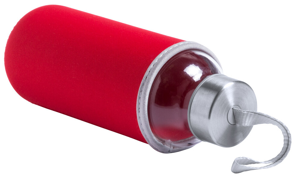 Skleněná láhev s popruhem na uzávěru a barevným neoprenovým krytem. 420 ml. Nevhodné pro sycené nápoje.