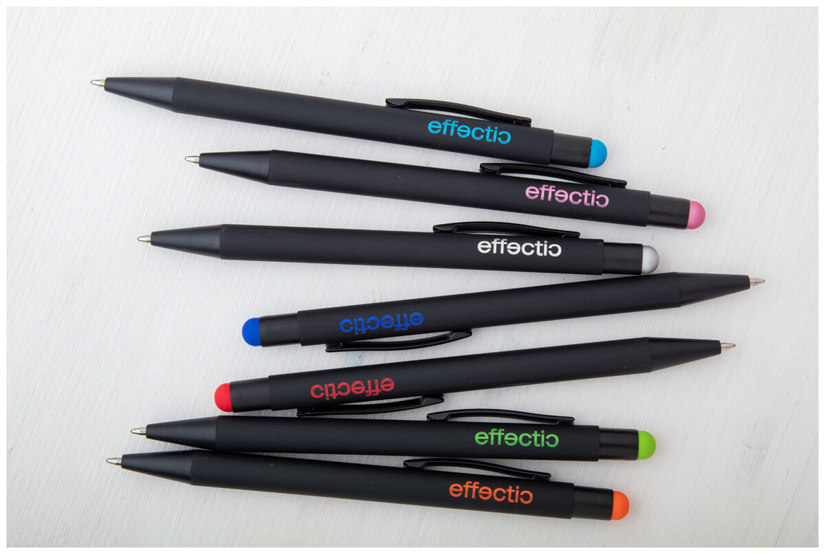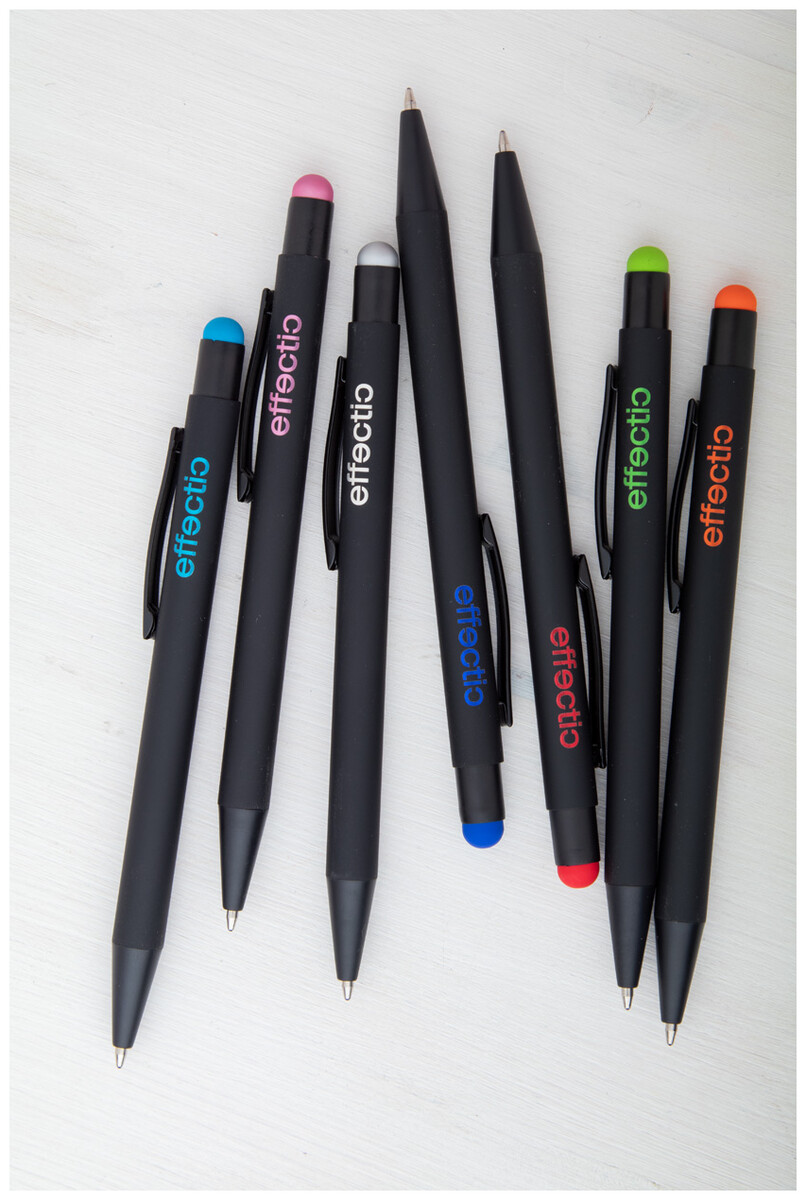 Hliníkové kuličkové a dotykové pero s pogumovanou úpravou a speciálním povrchem pro zrcadlový laser v barvě stylusu, s modrou náplní.