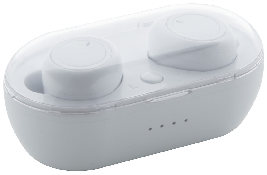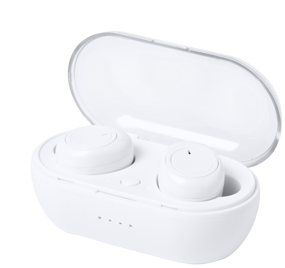 Skutečná bezdrátová stereofonní sluchátka (TWS) s funkcí hands-free volání v plastovém nabíjecím pouzdře. Včetně nabíjecího kabelu USB.