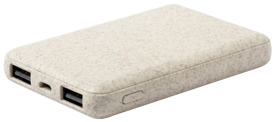 Power banka z ekologického plastu z pšeničné slámy s 5000 mAh baterií a 2 USB výstupy. Včetně nabíjecího kabelu micro USB.
