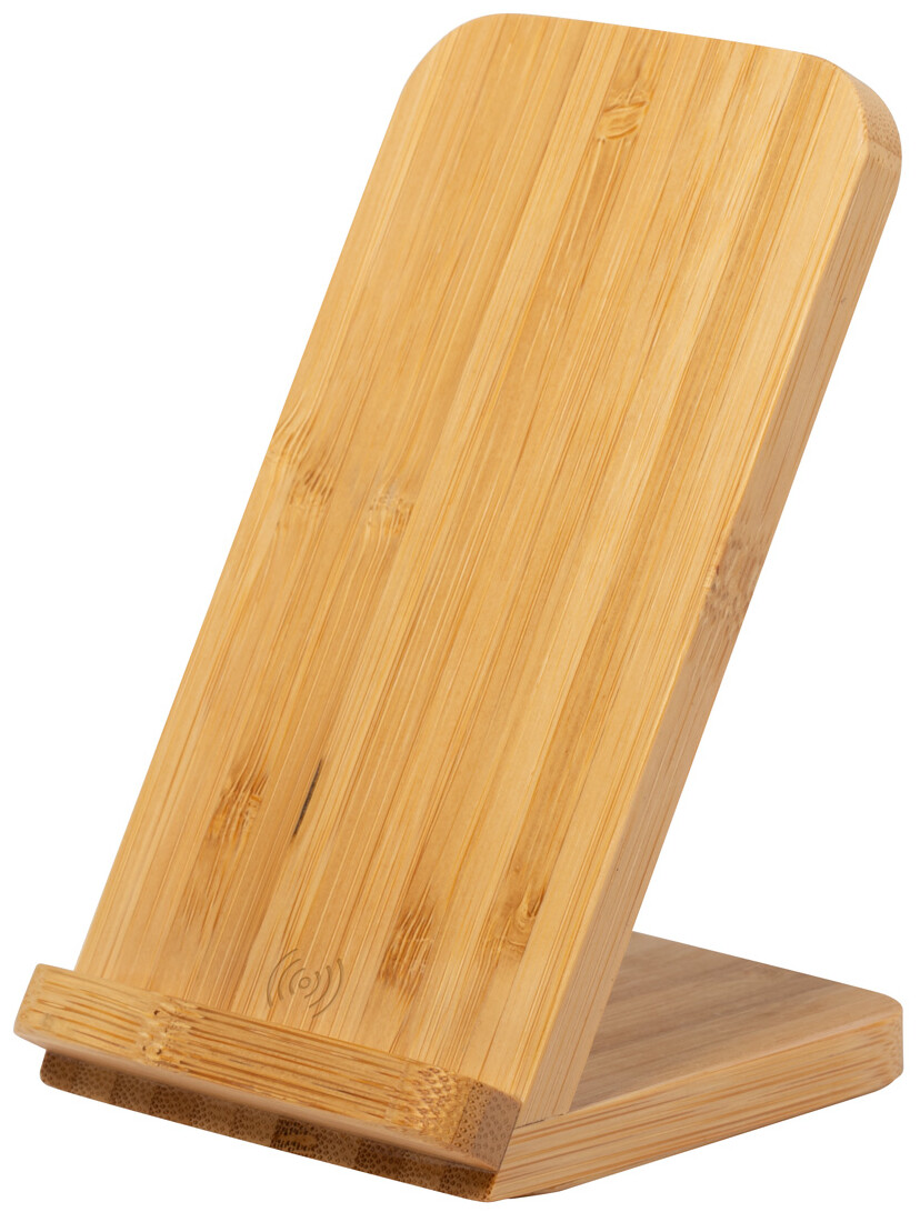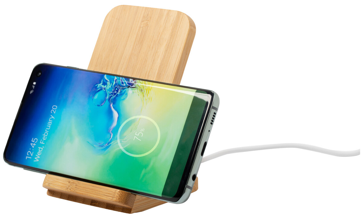 Stojánek na mobil z bambusu s vestavěnou bezdrátovou nabíječkou (10W). Včetně nabíjecího USB kabelu.