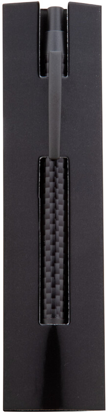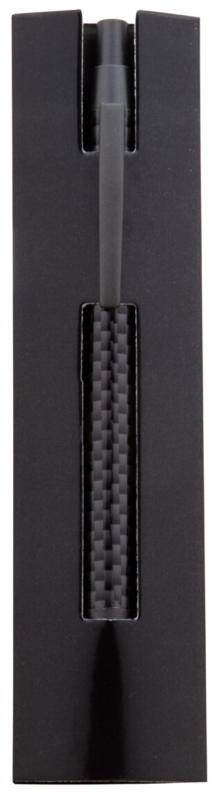 Kovové kuličkové pero s karbonovým vzorem na těle, v černém papírovém pouzdře, s modrou náplní.