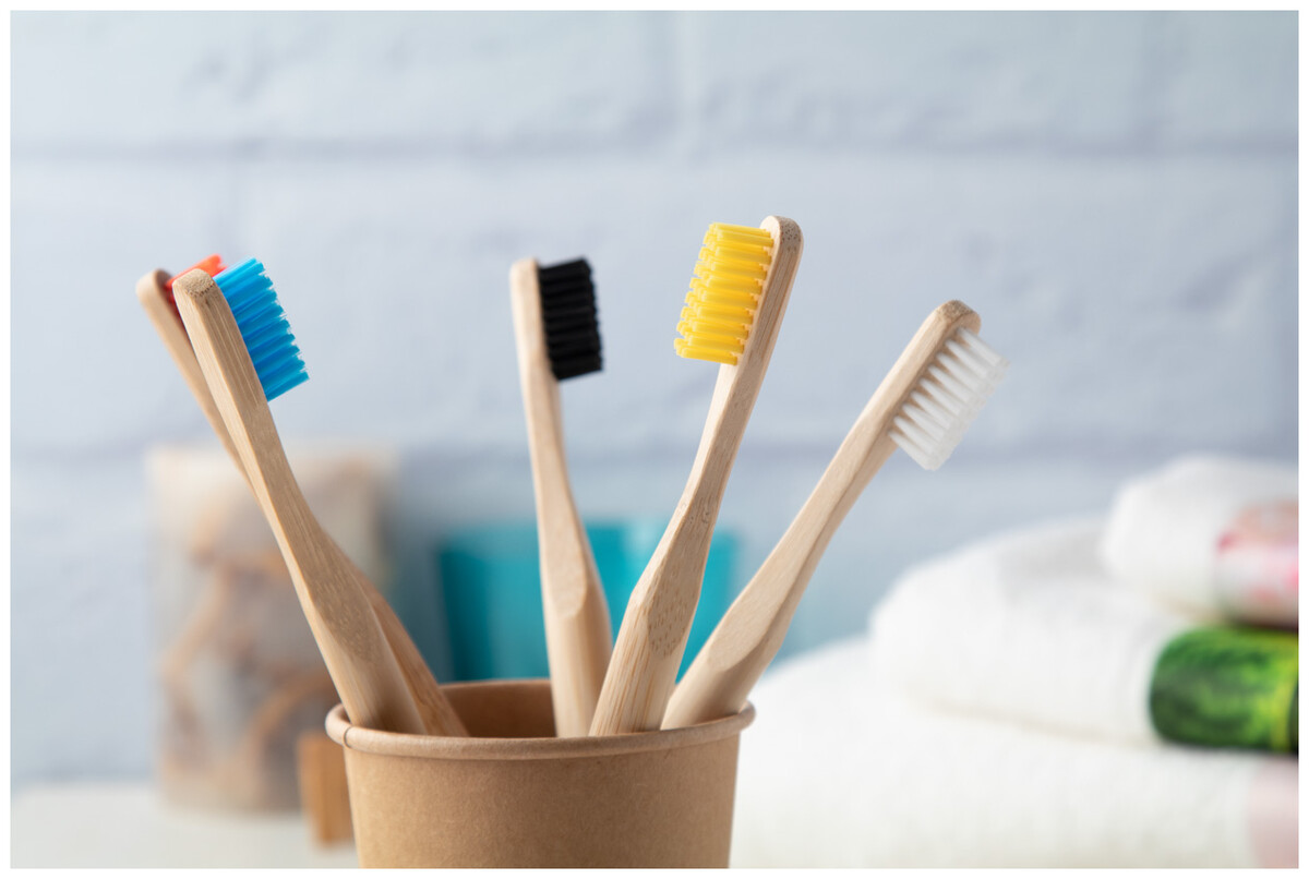 Kartáček na zuby pro dospělé z bambusu a barevnými nylonovými štětinami a barevným koncem držadla. V kraftové papírové krabičce.