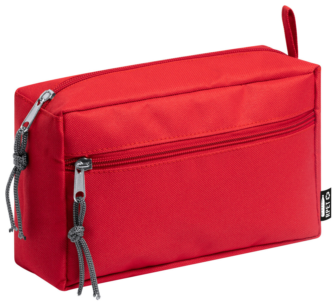 Kosmetická taštička z 600D RPET polyesteru se 2 přihrádkami na zip, s etiketou s označením RPET.