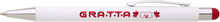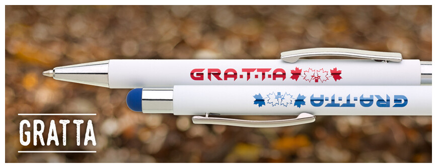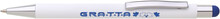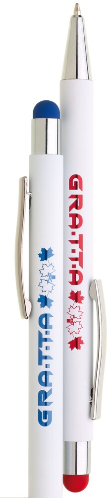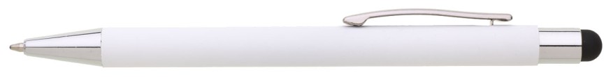 Bílá kovová propiska s černým touch koncem. Logo po vylaserování je v barvě touch – leskle černá.