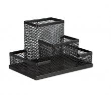 Kovový drátěný stojánek se čtyřmi přihrádkami na psací a kancelářské potřeby, šířka 15,5 cm, výška 10 cm, hloubka 10 cm. Barva: černá.