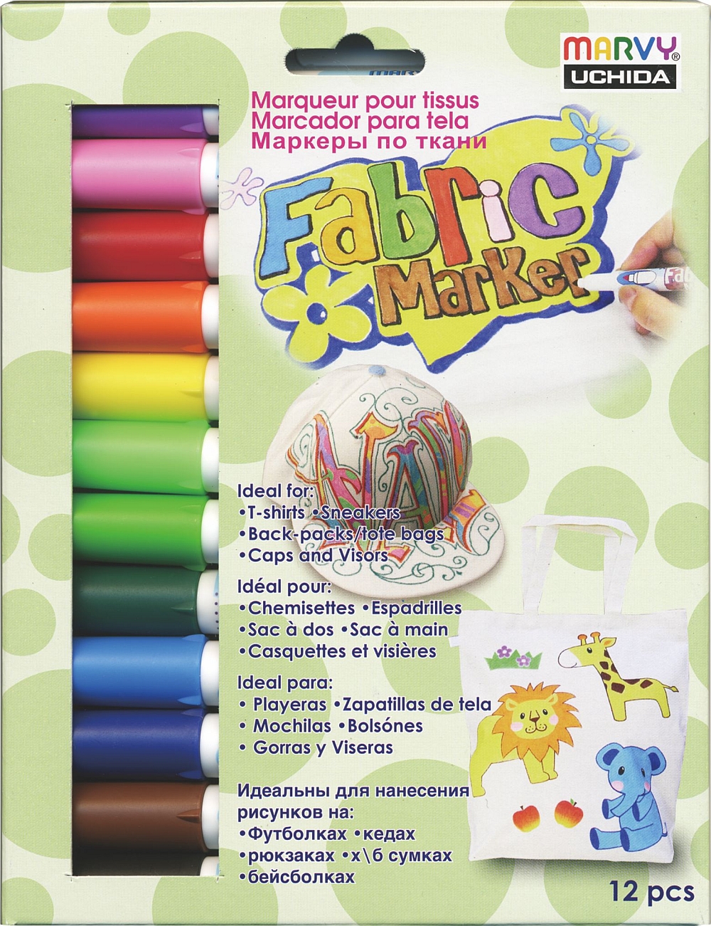 Sada popisovačů se štětečkovým hrotem na textil v 12ti barevných odstínech: černá, hnědá, tm.modrá, sv.modrá, fialová, růžová, červená, oranžová, žlutá, zelená. Vhodné pro kreslení linek, obrysů, vybarvování větších ploch. Po aplikaci barvy ihned zasychají, není třeba je fixovat. Vhodné na světlý před malováním vypraný textil. Po aplikaci doporučujeme ruční praní na 30 stupňů. Popisovače jsou bez zápachu a jsou netoxické.