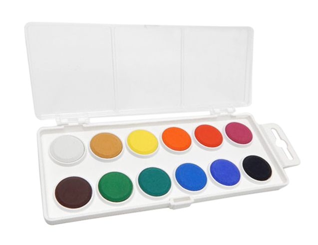 Školní vodové barvy 12ti odstínů s tabletami o průměru 22,5 mm v obdélníkových, plastových, jednopatrových barevnících s transparentním víčkem. Barvy jsou výrazné, vyznačují se svým vysokým obsahem pigmentů. Jsou certifikované a zcela bezpečné pro děti.