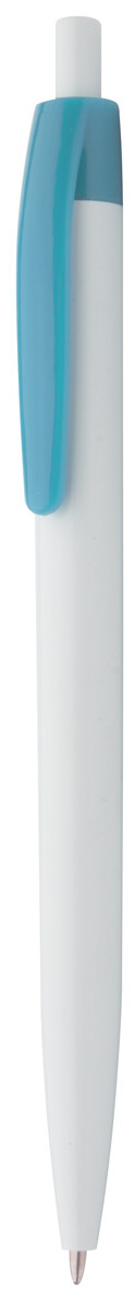Plastové kuličkové pero s bílým tělem a barevným klipem, s modrou náplní.