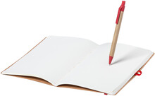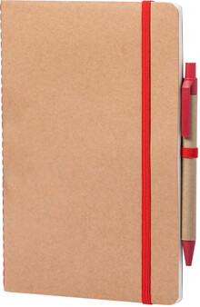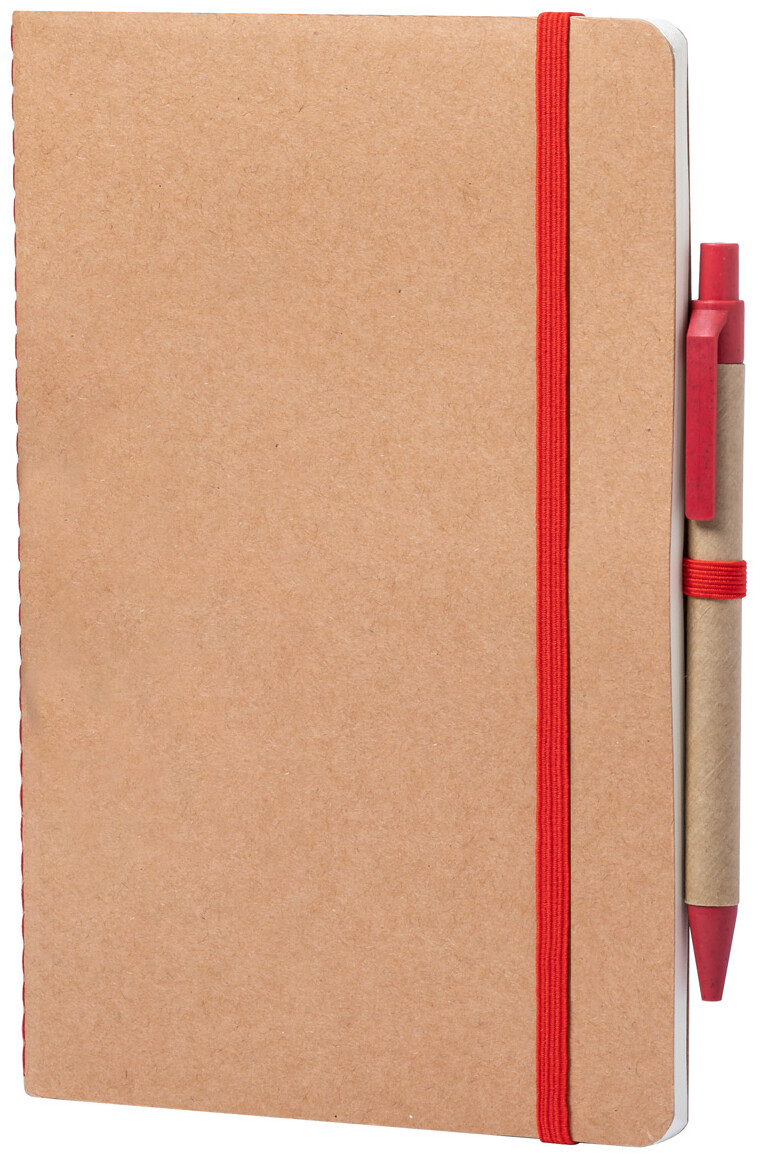 Blok A5 z recyklovaného kartonu s 60 čistými listy a barevnou gumičkou. Včetně plastového kuličkového pera z pšeničné slámy s modrou náplní.