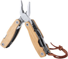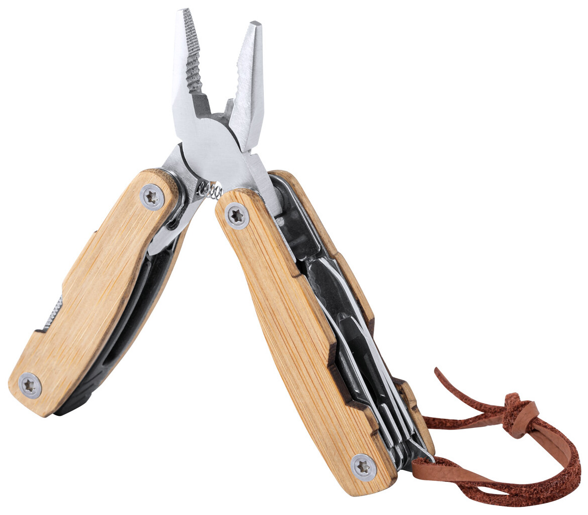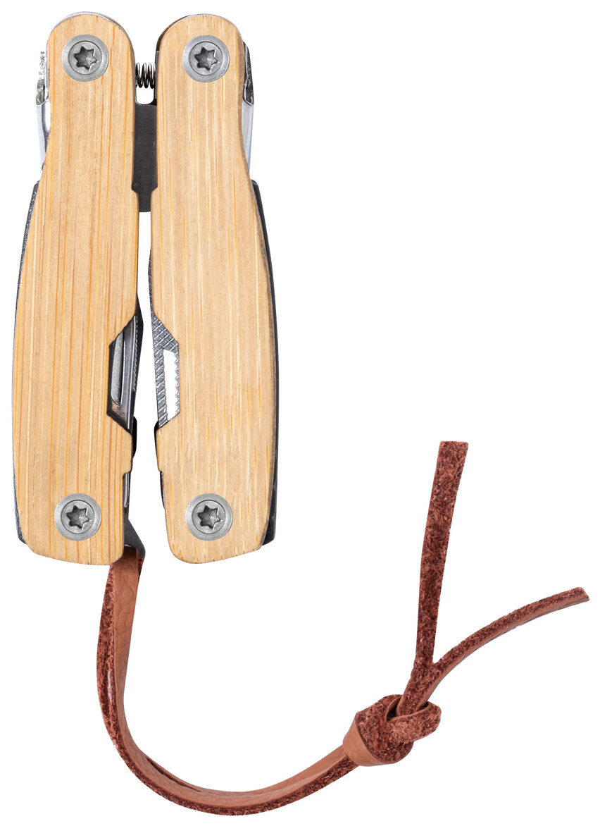 Multifunkční nářadí z nerezové oceli s bambusovými rukojeťmi a 12 funkcemi. S páskem z PU kůže.