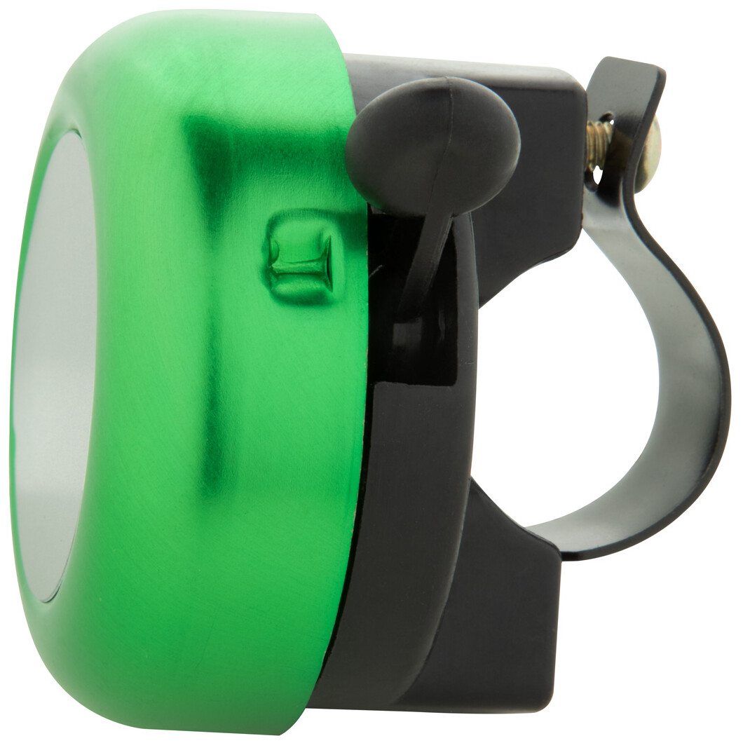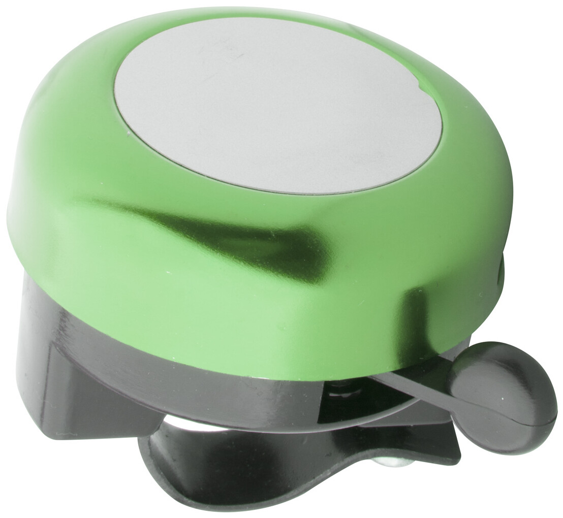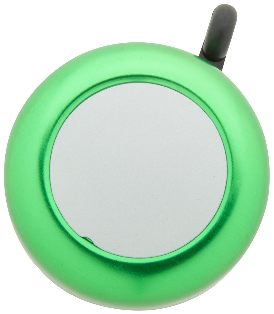 Hliníkový zvonek na kolo se stříbrnou plochou.