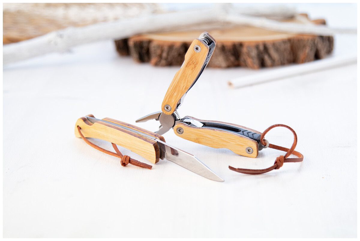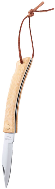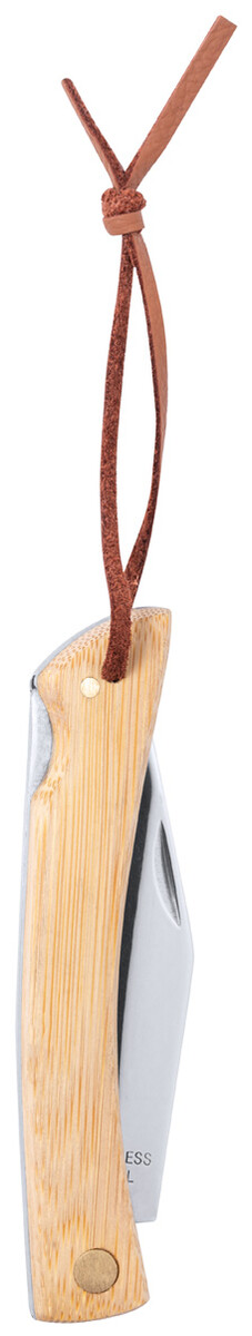 Kapesní nůž z nerezové oceli s bambusovou rukojetí a páskem z PU kůže. S bezpečnostní pojistkou.