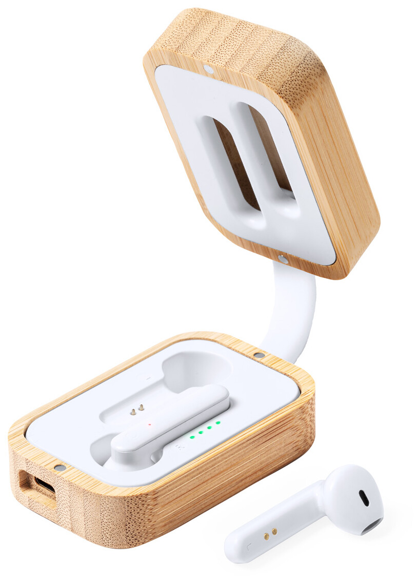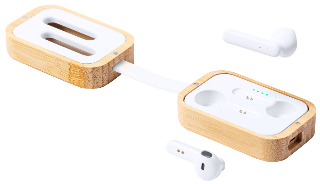 Skutečná bezdrátová stereofonní sluchátka (TWS) s funkcí hands-free volání v bambusovém nabíjecím pouzdře. Včetně nabíjecího kabelu USB.