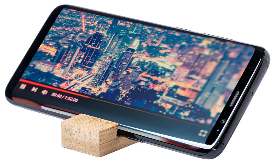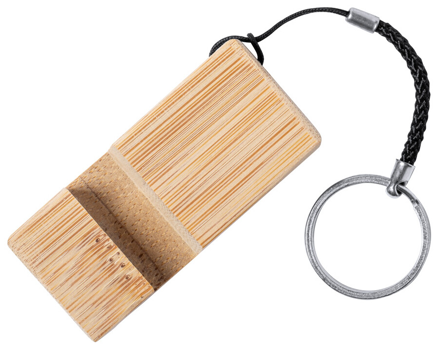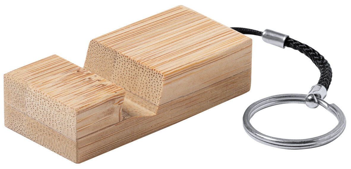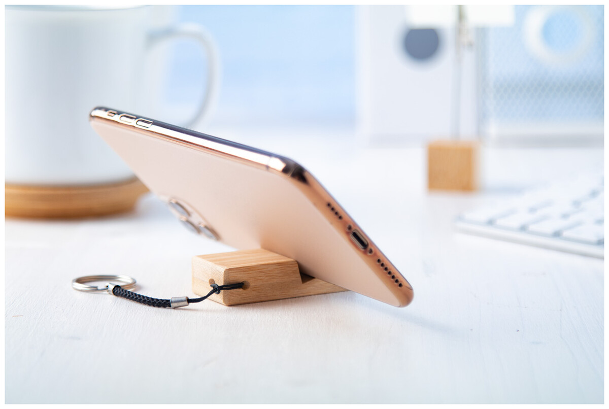 Bambusový stojánek na mobil s přívěškem na klíče.
