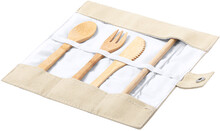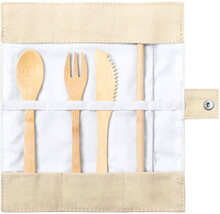 Sada 5 ks bambusových příborů v bavlněném pouzdře. Včetně vidličky, nože, lžíce, brčka na pití a čisticího kartáčku.