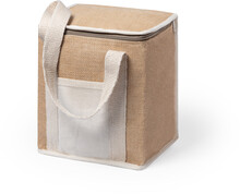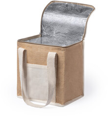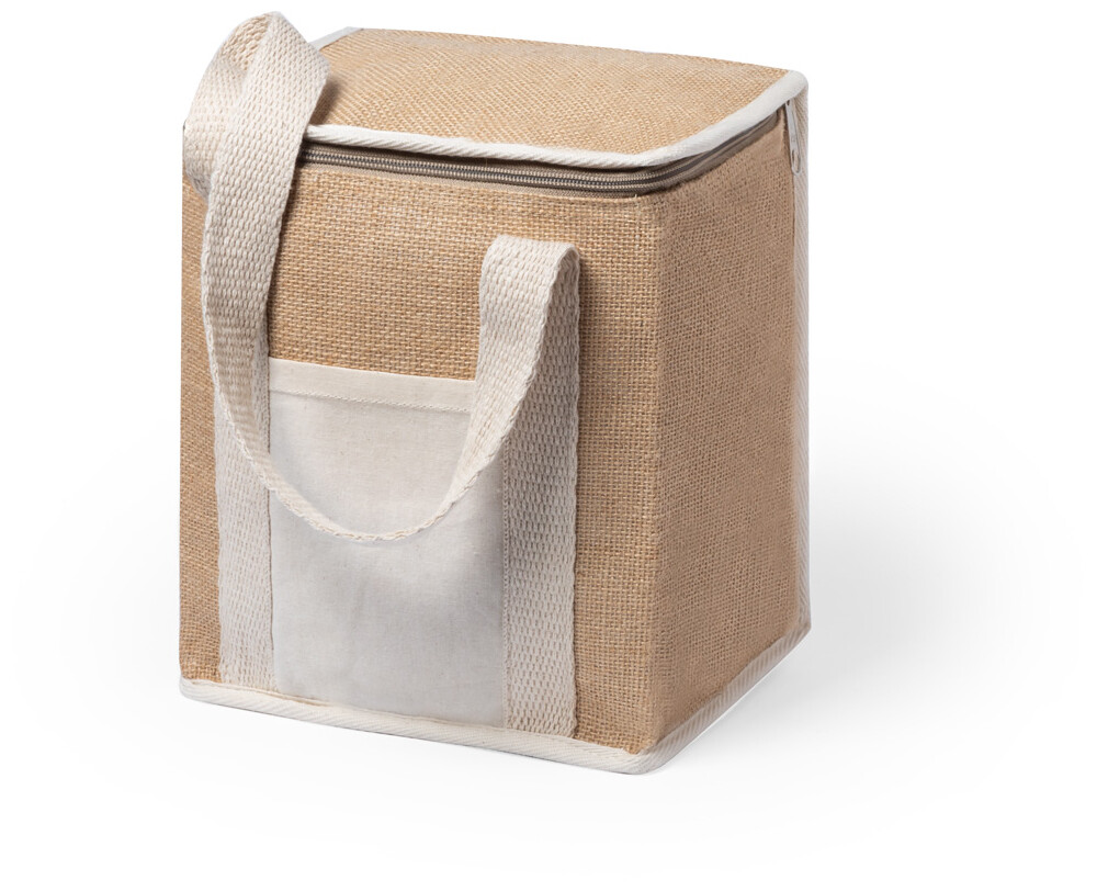 Chladící taška na zip z laminované juty a bavlny s hliníkovou výplní. S přední kapsou z bavlny, ideální pro potisk.