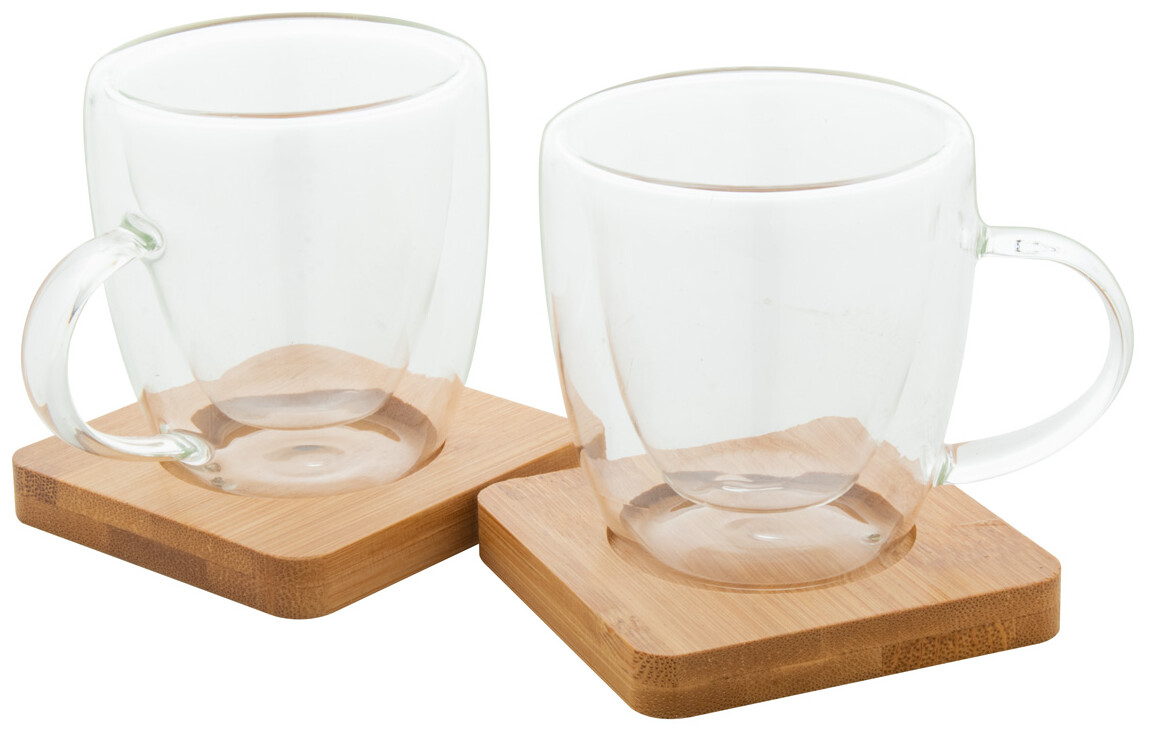 Sada šálků na espresso z borosilikátového skla s dvojitou stěnou, 2 ks šálků a bambusovými podšálky, 90 ml. V krabičce ze sulfátového papíru.