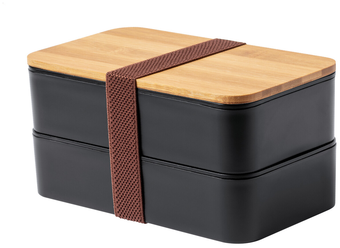 Box na jídlo z PP plastu se sadou příborů (vidlička, lžíce a nůž), bambusovým víkem a elastickým popruhem. Se 2 přihrádkami o objemu 700 ml.
