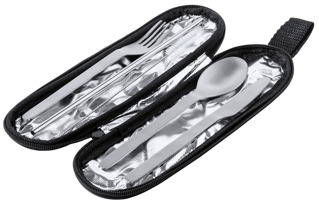5dílná sada příborů z nerezové oceli v polyesterovém pouzdře RPET. Včetně vidličky, nože, lžíce, brčka a čisticího kartáčku.