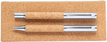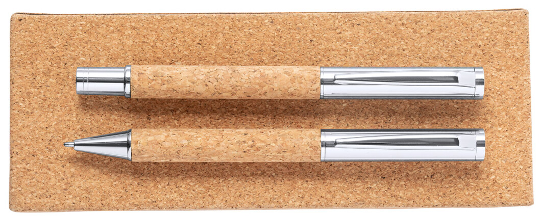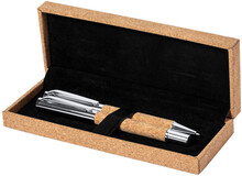 Elegantní sada kovového kuličkového pera a rolleru s tělem potaženým přírodním korkem. V dárkové krabičce z přírodního korku, s modrou náplní.