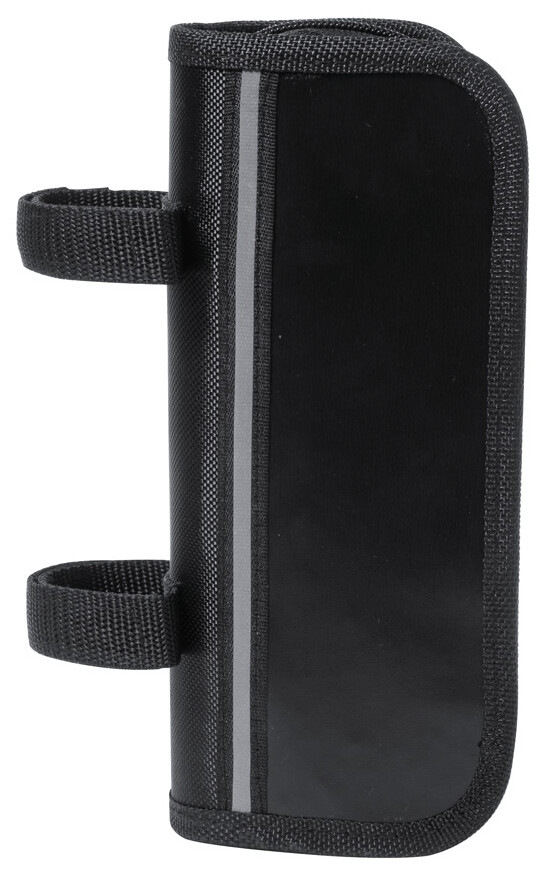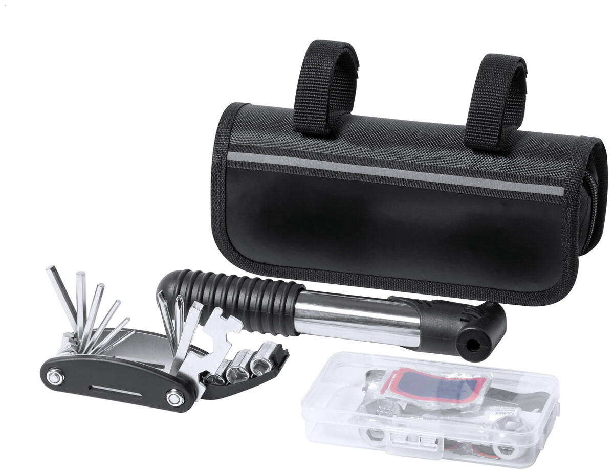 Sada na opravu jízdního kola v praktické tašce na rám kola. Včetně: 15 funkcí multifunkčního nářadí, šestihranného klíče, mini pumpy a sady na opravu defektu (2 páčky na pneumatiky, struhadlo a 6 záplat). 600D polyester.