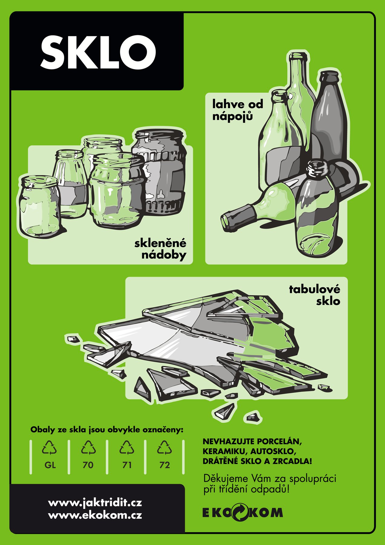 Zelená samolepka o velikosti A4 je vhodná zejména pro označení interiérových nádob (košů) určených pro třídění odpadu. Samolepka je vyrobena z polypropylenu - je omyvatelná. Samolepka znázorňuje graficky i textem, jak správně vytřídit skleněné odpady. Rozměr: 209mm x 297mm.