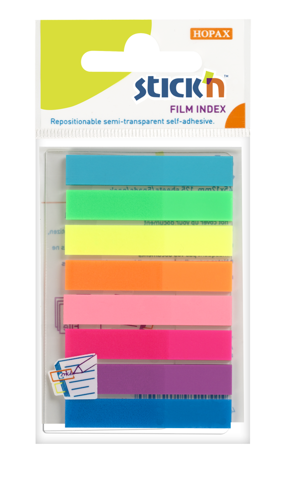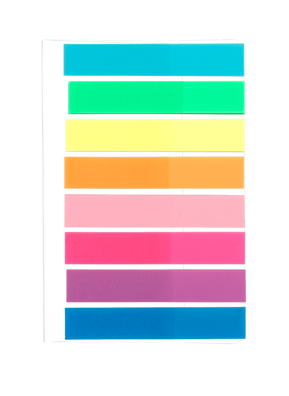 Plastové průhledné samolepicí záložky vyrobené z barevné transparentní fólie, která nezakrývá text a je jednoduše popisovatelná. Snadno je nalepíte a odlepíte bez zanechání stop po lepidle. Perfektní pro označování textů či zakládání stran.