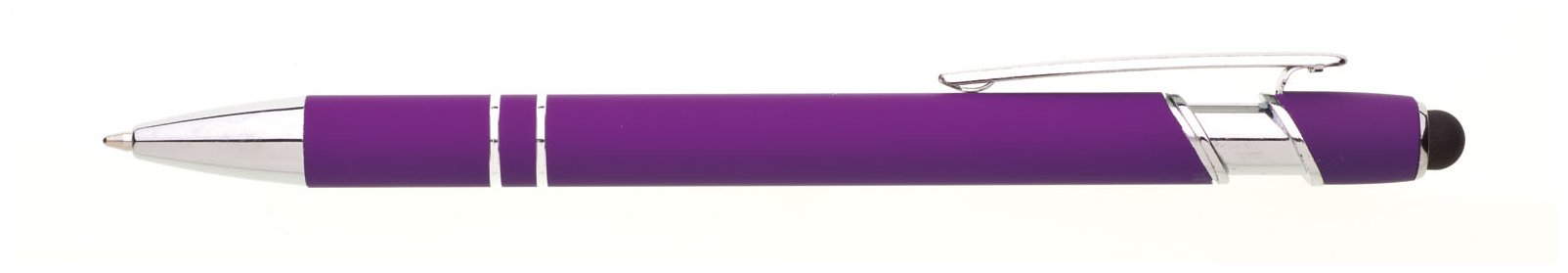 Propiska s touch koncem, měkkým pogumovaným soft povrchem ve fialové barvě a stříbrnými doplňky včetně dvou ozdobných kroužků. (NATIO)