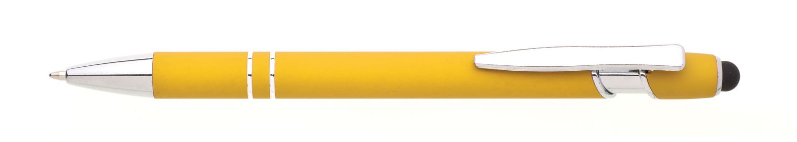 Propiska s touch koncem, měkkým pogumovaným soft povrchem ve žluté barvě a stříbrnými doplňky včetně dvou ozdobných kroužků. (NATIO)