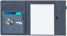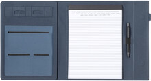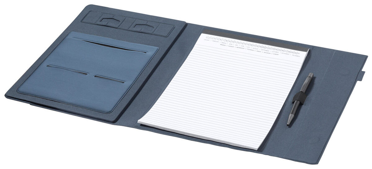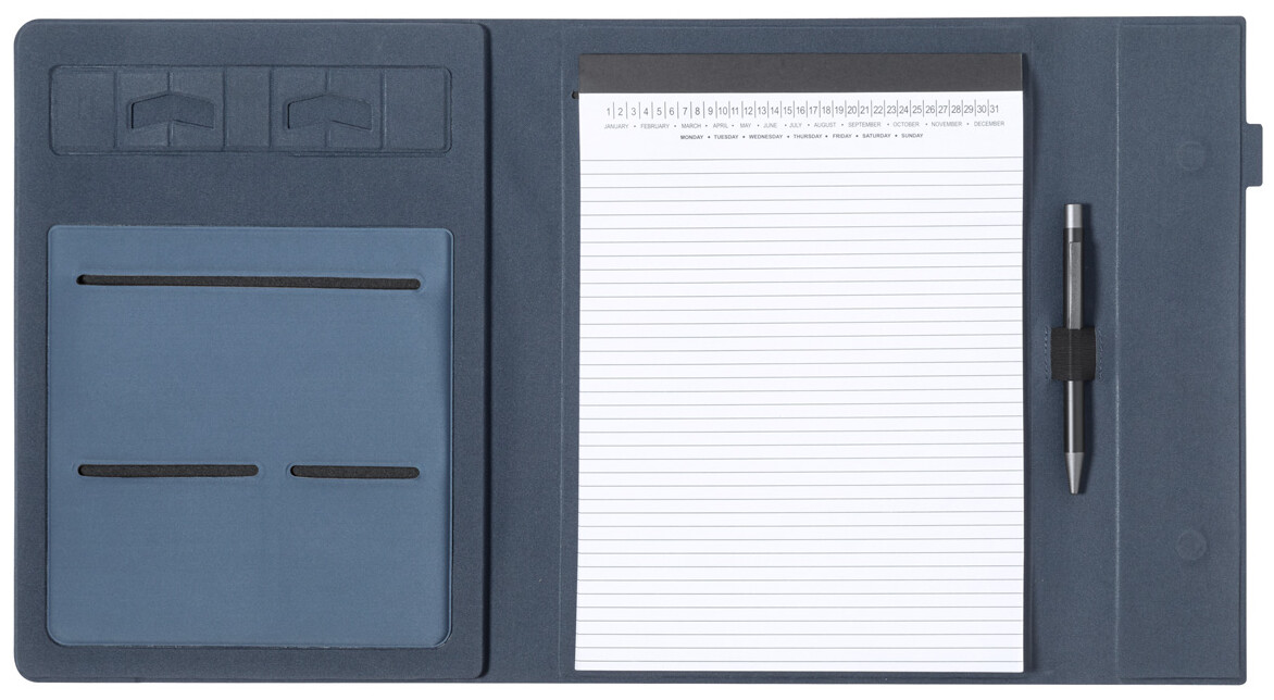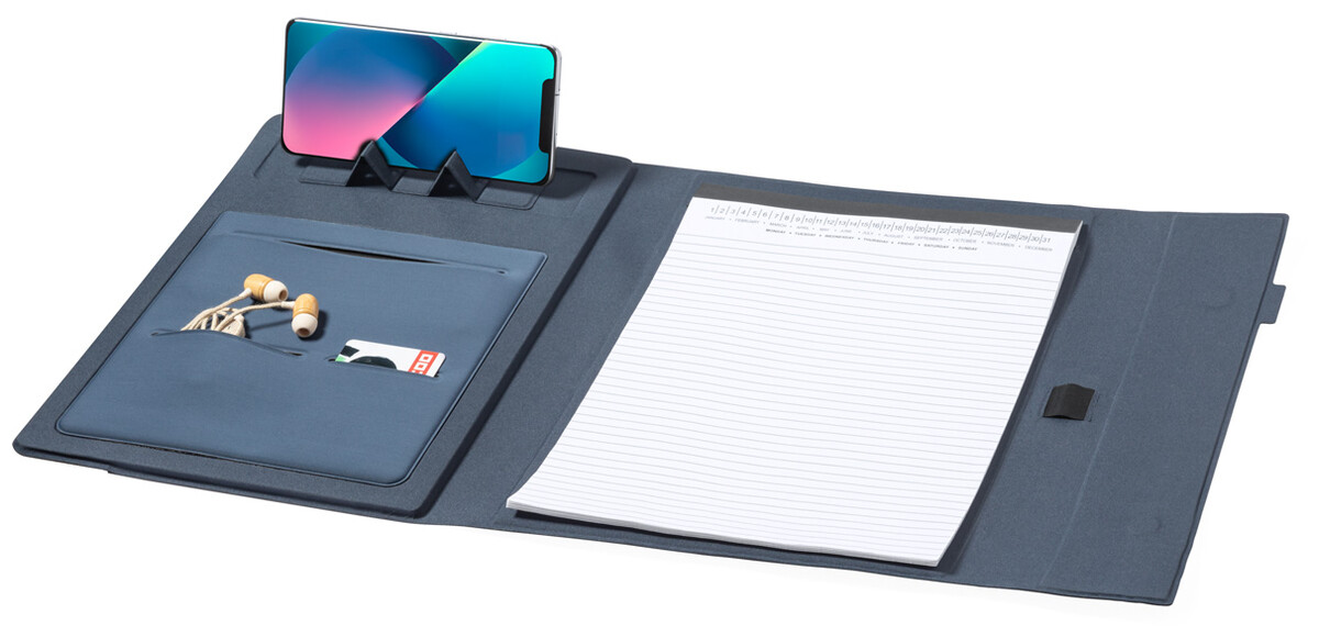 Polyesterová sloha na dokumenty A4 z 600D RPET s magnetickým zavíráním, skládacím držákem na mobil a poznámkovým blokem na 20 linkovaných listů. S výrazným štítkem RPET.
