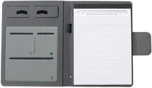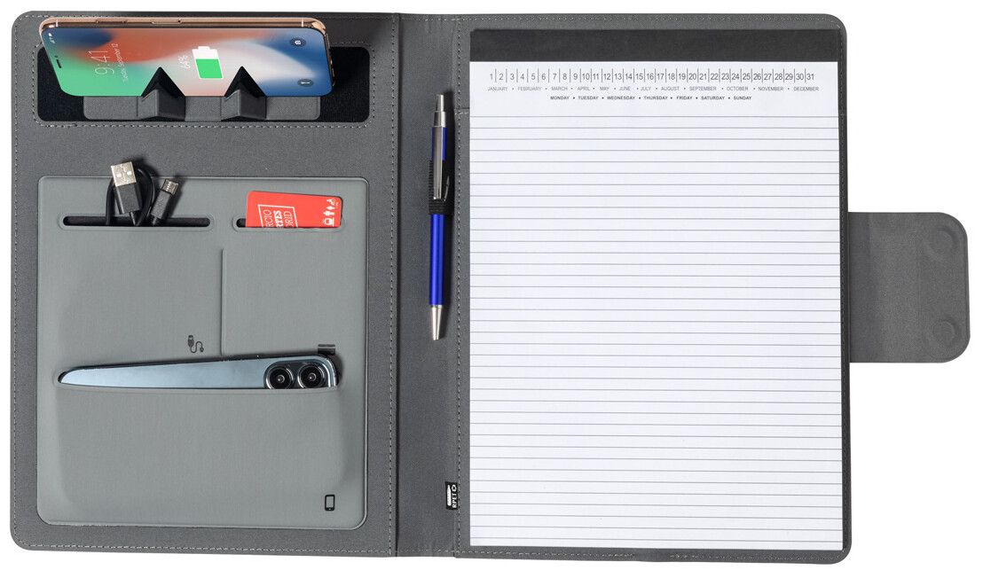 Polyesterová sloha na dokumenty A4 z 300D RPET s vestavěnou magnetickou bezdrátovou rychlonabíječkou (10W), powerbankou 5000 mAh s USB portem pro nabíjení, skládacím držákem na mobil a 20 linkovaným poznámkovým blokem. Včetně samolepícího kovového kroužku pro použití magnetické funkce na jakémkoli bezdrátově nabíjecím zařízení. Včetně USB nabíjecího kabelu.