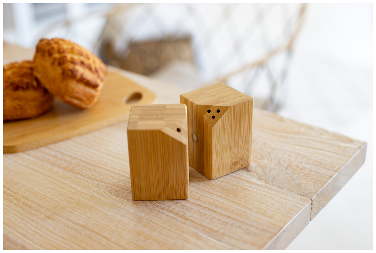 Sada 2 ks bambusové solničky a pepřenky. Sada je spojena ve středu díky magnetům umístěným na straně.