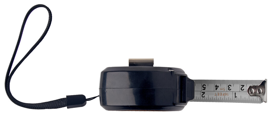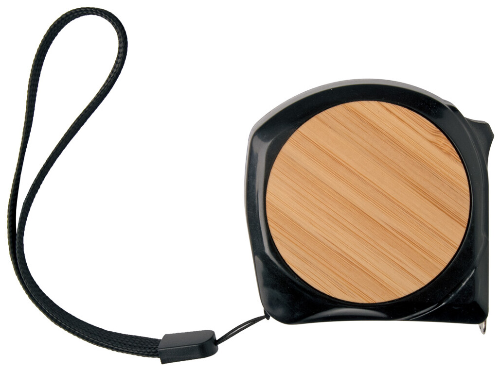 Plastový a bambusový svinovací metr s aretací, kovovým klipem a poutkem na ruku, 5 m.