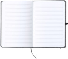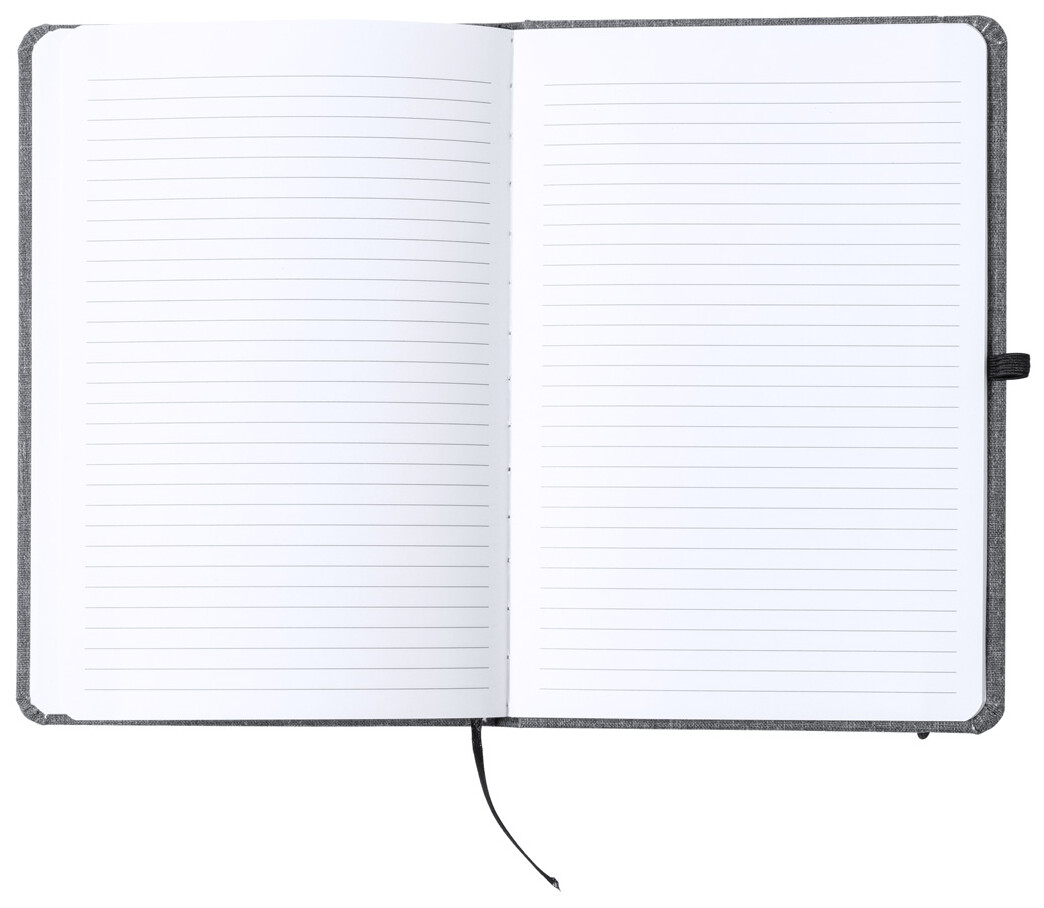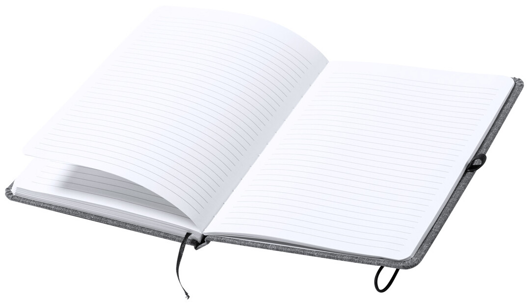 Zápisník potažený polyesterem 600D RPET se 100 linkovanými listy, záložkou a gumičkou. Velikost A5.