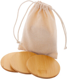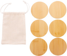 6dílná sada kulatých bambusových podtácků v bavlněném pytlíku se stahovací šňůrkou.