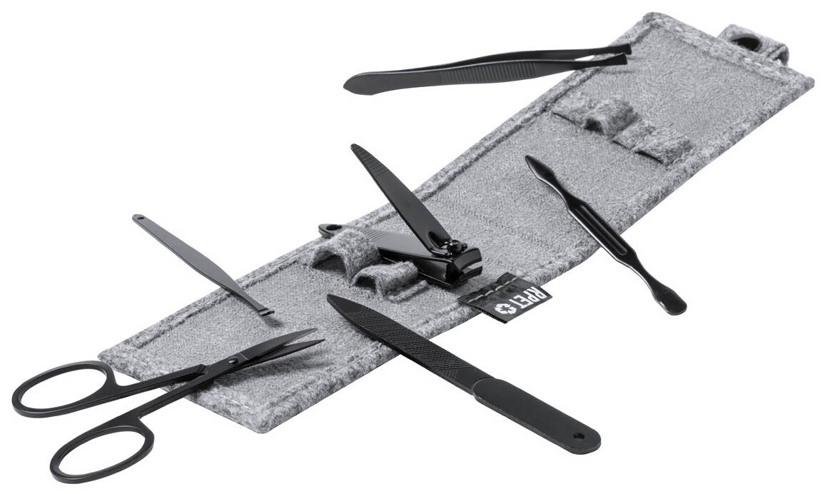 6dílná manikúra z nerezové oceli v plstěném pouzdře RPET. Obsahuje nůžky, nůžky na nehty, pilník na nehty, pinzetu a 2 odstraňovače kůžičky.