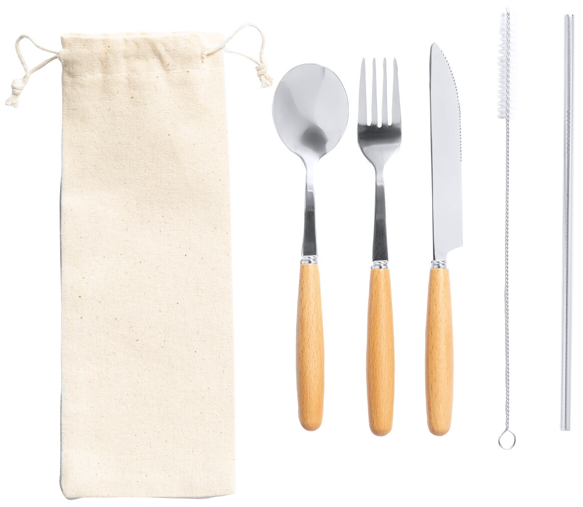 5dílná sada příborů z nerezové oceli s dřevěnou rukojetí, v bavlněném pytlíku se stahovací šňůrkou. Včetně vidličky, nože, lžíce, brčka a kartáčku na čištění.